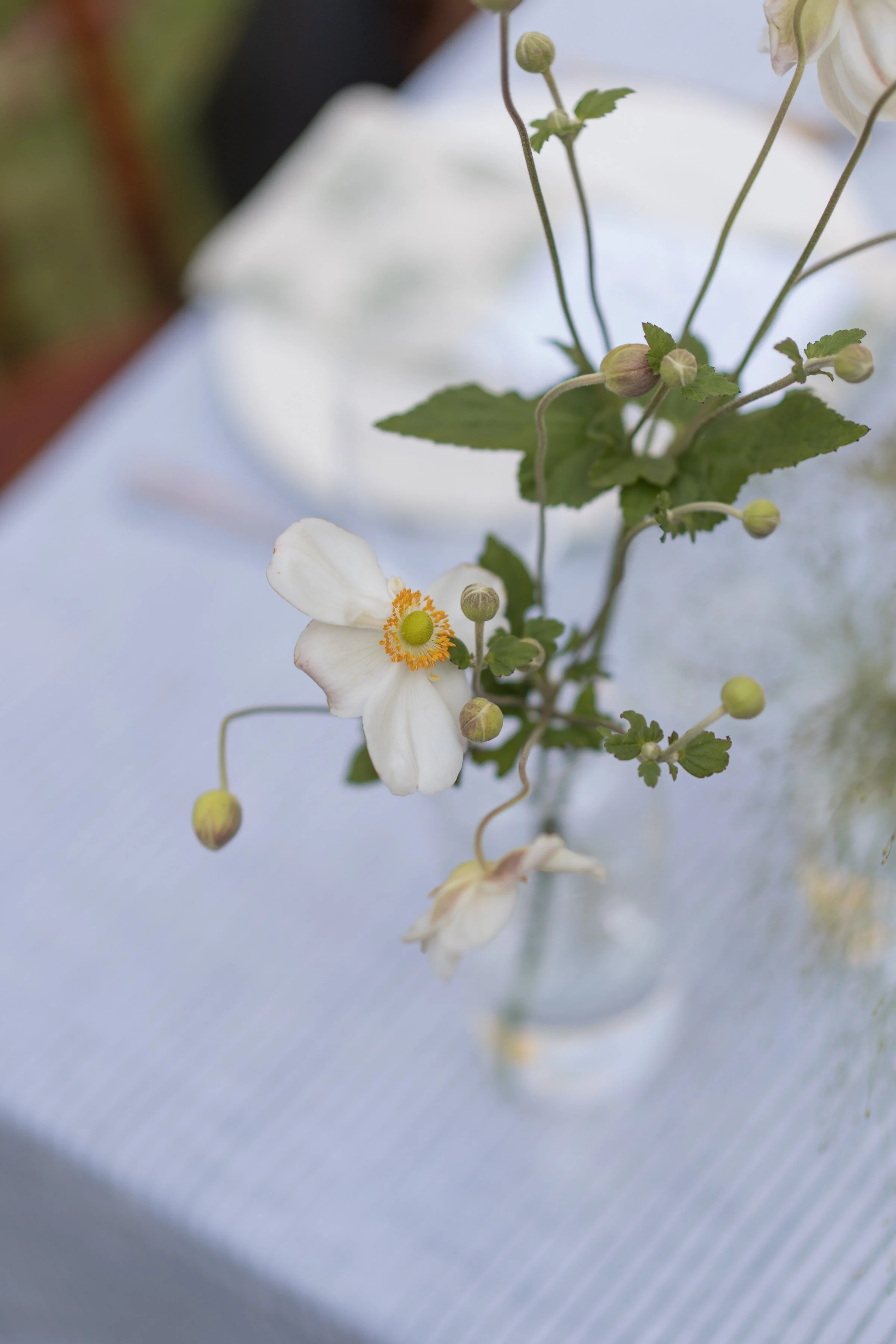 To complement the beautifully crafted linens, we designed an understated yet lush tablescape. Delicate bud vases held a curated selection of seasonal blooms, each one carefully chosen to enhance the soft, natural aesthetic of the linens. The color palette featured: